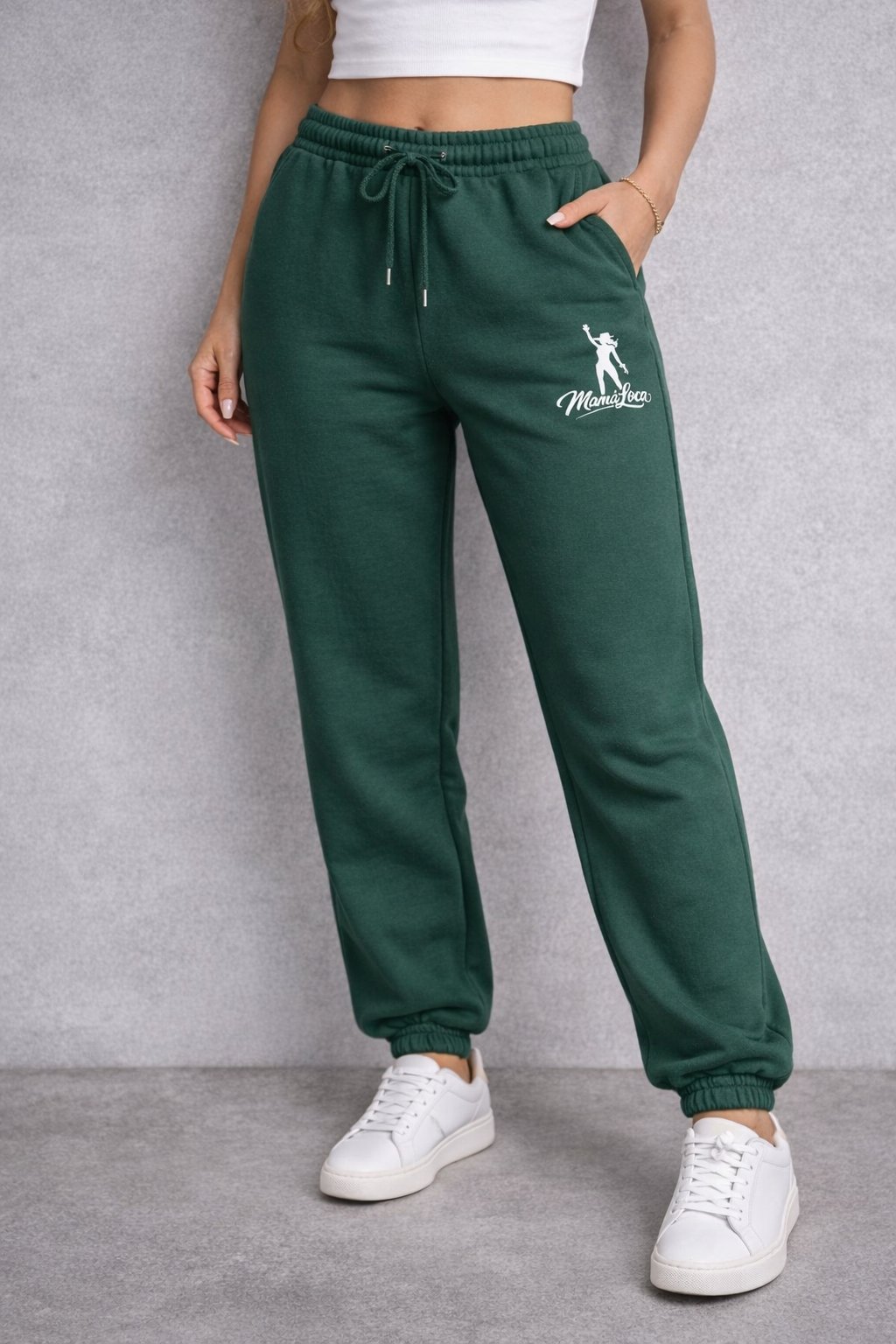 GREEN SWEATPANTS WITH A WHITE LOGO ON THE LEFT SIDE